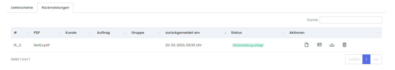 In der Rückmeldungen-Übersicht sehen Sie alle Lieferscheine mit erfolgter Rückmeldung. Sie sehen das Datum der Rückmeldung und haben wieder die Möglichkeit, den Lieferschein anzuzeigen, herunterzuladen oder zu löschen.