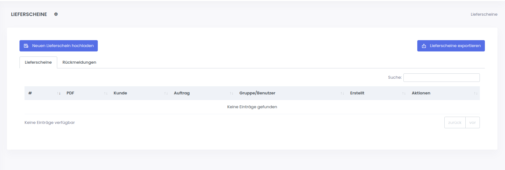 Sie befinden sich in der Lieferschein-Übersicht. Hier können Sie einen Neuen Lieferschein hochladen, bestehende bearbeiten oder Lieferscheine exportieren. Außerdem können Sie in den Rückmeldungen-Tab wechseln, wo alle Lieferscheine mit erfolgter Rückmeldung angezeigt werden.